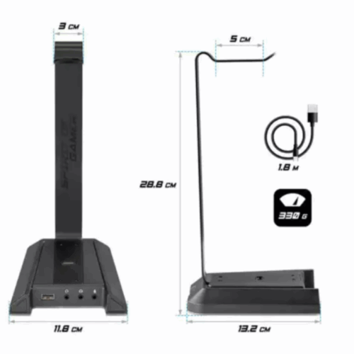 Support de casque SPIRIT OF GAMER STD5 SENTINEL 7.1 – Interface: Jack 3.5 mm,2 x Jack 3.5,2 x USB – Hauteur du support: 24 cm – Rétro-éclairage RGB 9 effets prédéfinis – Longueur du câble: 1.8 mètre – Support pour casque avec Son Surround 7.1 – Dimensions: 24.8 x 13.2 x 11.8 cm – Poids: 330 g – Couleur: gris