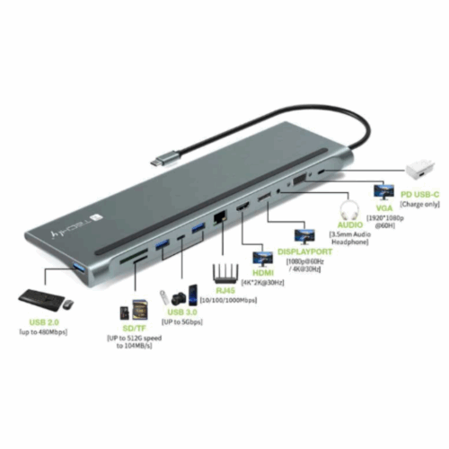 Station d’accueil SANDBERG 136-45, Nombre de Ports: 13 ports, Interface: USB-C, La résolution Pris en charge: HDMI jusqu’à 4k maximum à 30Hz (1920 x 1080P à 60 Hz), la résolution VGA jusqu’à 1920 x 1080P à 60 Hz, Prend en charge la sortie simultanée à 2xHDMI et 1xVGA (le moniteur VGA affiche le même contenu que l’un des moniteurs HDMI), Connecteurs sortie: 1 x USB-C (supportant jusqu’à 100 W), 1 x USB-C pour les données, 2 x HDMI, 1 x VGA , 3 x USB 3.0 A, 1 x USB 2.0 femelle, 1 x RJ45, 1 x sortie audio, 1 x lecteur de carte SD prenant en charge SD/SDHC/SDXC/MMC, lecteur de carte Micro SD/TF. Boîtier en aluminium.