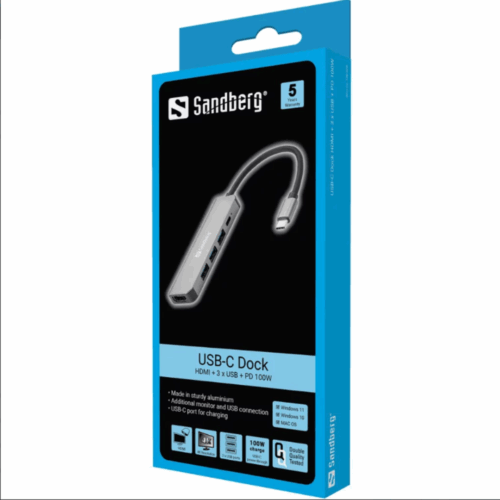 Station d’accueil SANDBERG Dock – Entrée: USB-C mâle – Sorties: HDMI femelle, USB-C femelle (pour une alimentation prenant en charge jusqu’à 100 W), 1 x USB 3.0 A femelle, 2 x USB 2.0 femelle – Prend en charge le format d’image grand écran du streaming vidéo Full HD 4K 16:9 – Prend en charge le miroir d’affichage de bureau, le mode extension, le mode multi-écran et le mode rotation de l’écran – Le moteur graphique USB hautes performances prend en charge la résolution 4K/30 Hz – Reconnaissance automatique du type de moniteur, de la résolution et des fonctionnalités – Boîtier en aluminium