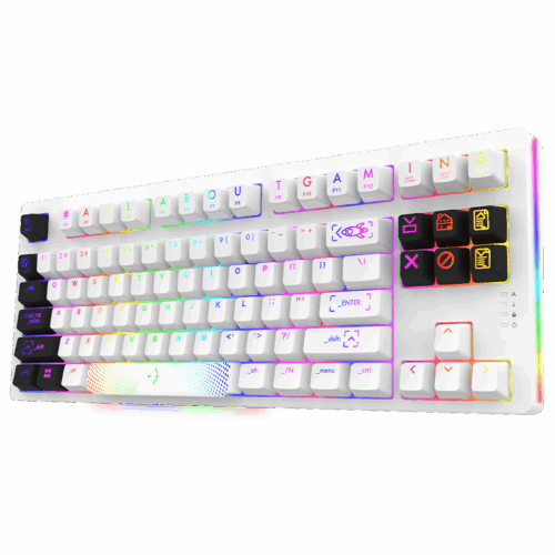 Clavier Gaming ALUDRA – Red switch – RGB dynamique par touche – Connectivité : Filaire – Câble : USB Type-C détachable, tressé – Longueur du câble : 1,8 m – Taille : 451x 141x 40 mm – Poids : 1311 g – Couleur blanc