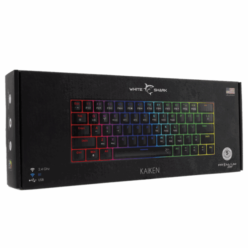 Clavier Gaming White Shark GK-003111 KAIKEN – Technologie de Connectivité : Filaire / Bluetooth / 2,4 GHz – Interface : USB 2.0 (Type C détachable) – Norme du clavier : Qwerty – Nombre de Touches : 63/64 Boutons – Type de commutateur : Mécanique (Switch Rouge) – Éclairage : RGB avec 22 effets différents – Disposition des touches : Compacte – Anti-Ghosting complet – Longueur du câble : 1.5 m – Matériel : Plastique – Compatibilité : Windows 7/8/10/11, Mac OS, Chrome OS – Dimensions : 291 x 102 x 40 mm – Poids : 417 g – Couleur : Noir