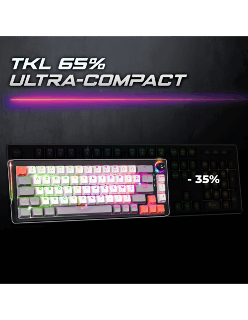 Clavier : Type : Membrane, Format : TKL 65% compact, Rétroéclairage : RGB Rainbow, Norme : AZERTY, Connexion : Filaire USB-A, Poids : 415 g