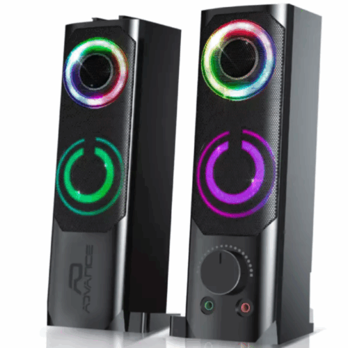 Enceinte ADVANCE SOUNDPHONIC 2.0 RMS – Connectivité: Filiare – Interface: Jack 3,5 mm USB 5V pour l’alimentation (1m) – Puissance: 6 Watts RMS – Fréquence: 60 Hz- 20 KHz – Diamètre des haut-parleurs: 5 cm – Système d’enceintes 2.0 modulable en une barre de son – Bouton volume – Rétroéclairage RGB Rainbow – Dimensions des enceintes: 185 x 58 x 75 mm – Dimensions de la barre de son: 72 x 370 x75 mm – Couleur: Noir