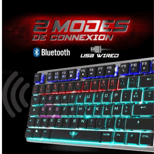 Clavier Mécanique San fil Spirit of Gamer K1300 – Red Switch – Technologie anti-ghosting complète – 3 touches principales – Rétro-éclairage RGB personnalisable (20 modes) – Châssis en aluminium – Connectivité : Bluetooth ou USB – Autonomie de la batterie : 12 heures – Temps de charge : 3 heures – Dimensions de l’appareil : 354 x 126 x 30 mm – Poids : 500g