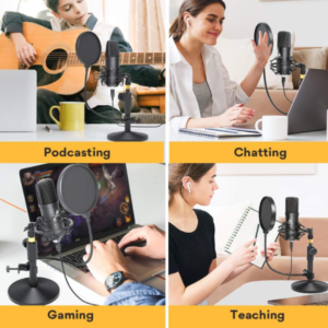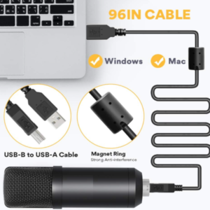 Connectivite: Filaire -Interface: USB – Sensibilité: -38 ± 3 dB – Réponse en fréquence: 30 Hz-16 kHz – Rapport signal bruit: 70 dB – Taux d’échantillonnage: 192Khz / 24bit – Niveau Sonore: 16 dB Max – Tension de fonctionnement: USB DC 5.0 V – Unidirectionnel- Un excellent microphone pour des enregistrements sonores de haute qualité pour les joueurs et les producteurs vidéo exigeants, durable et compatible avec tous les ordinateurs – Matériau: Aluminium + Plastique ABS – Couleur: Noir