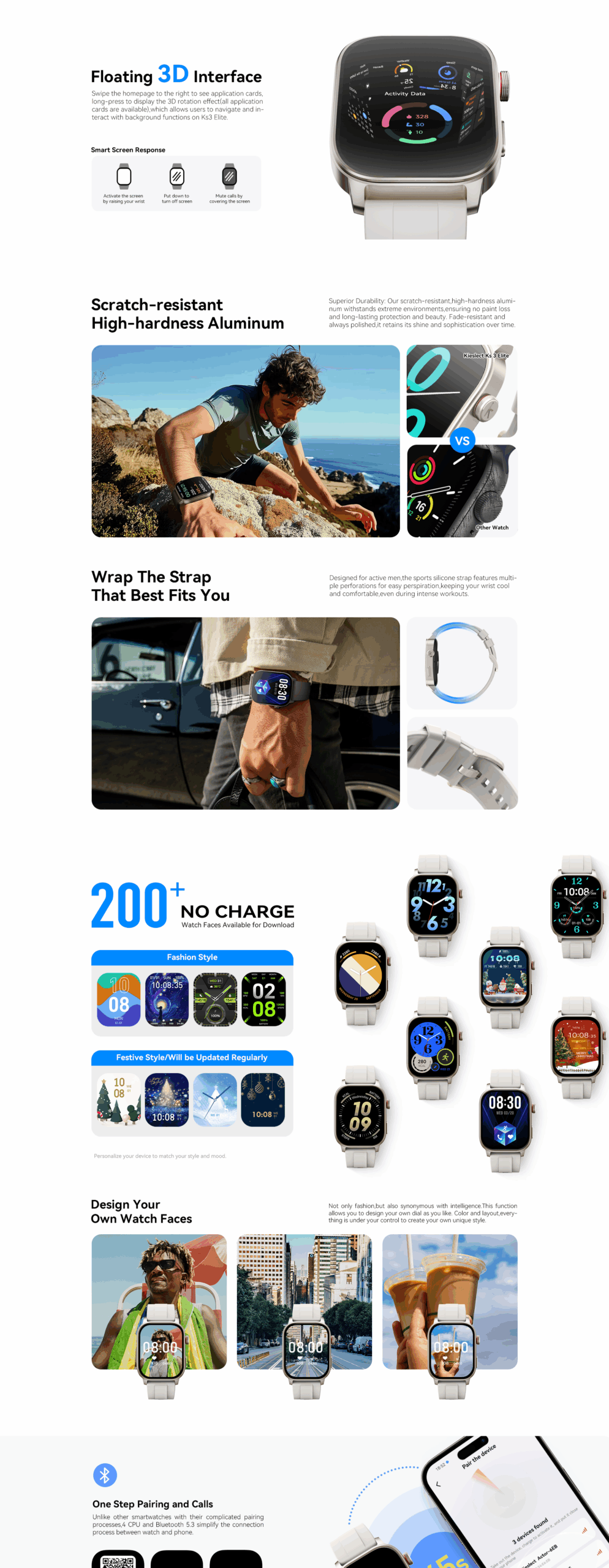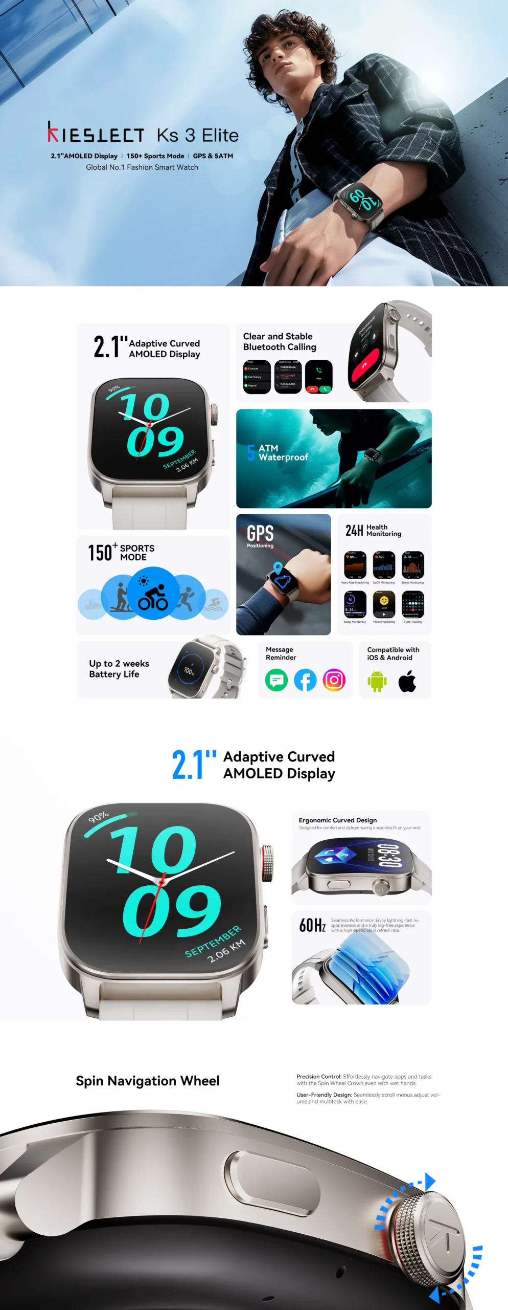 mart Watch Kieslect Calling Watch KS3 Elite – Ecran : Amoled 2.1 Pouces (410 x 502 pixels) – Système d’exploitation : Android, iOS – Connectivité : Bluetooth 5.3 – Capacité de la batterie : 400 mAh – Autonomie : 15 jours ( Mode économie de batterie 50 jours)- Temps de charge : moins de 2.5 heures – Luminosité 1000 nits – Taux de rafraichissement : 60Hz – GPS : Positionnement GPS de précision et 6 systèmes satellites – Appels Bluetooth clairs et stables – Plus de 150 modes sportifs ( Marche en plein air, Course à pied, Course en salle, Machine elliptique…) – Surveillance de la santé 24h/24h – Faites tourner la molette de navigation – Interface flottante 3D – 20 Langues – Etanchéité: 5ATM – Couleur : Starlight