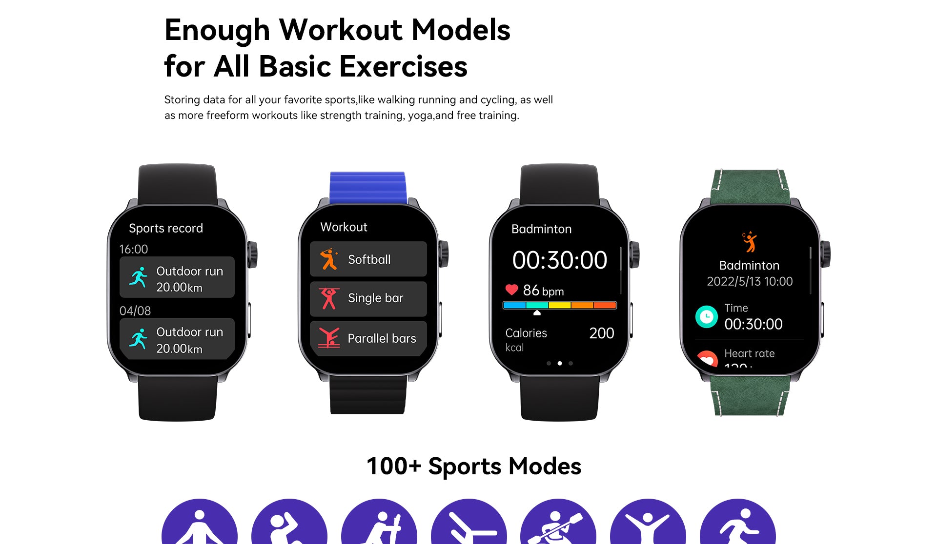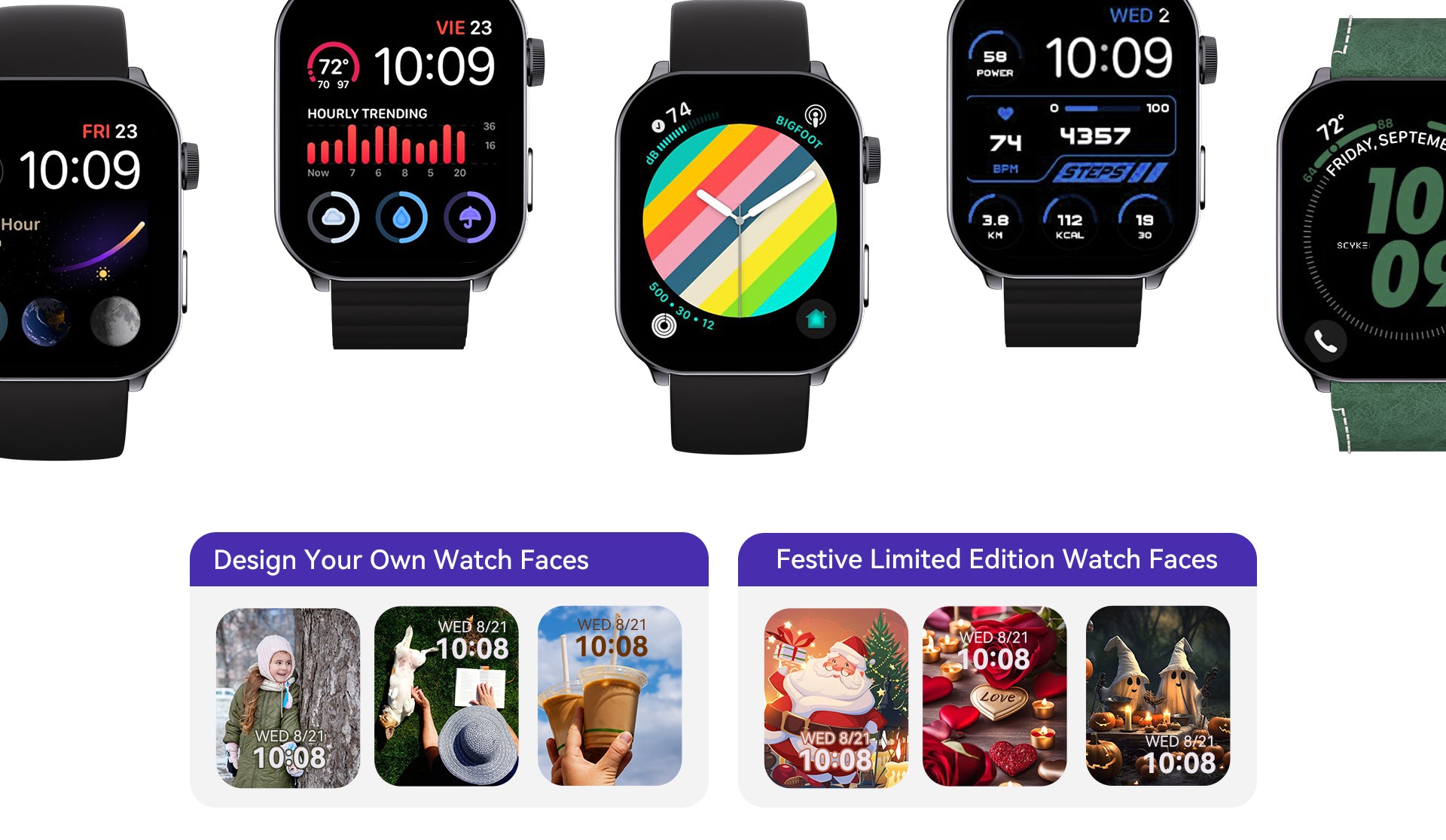 | Fonctions santé & utilitaires | Fréquence cardiaque, SpO₂, stress, entraînement respiratoire, appels Bluetooth, notifications |