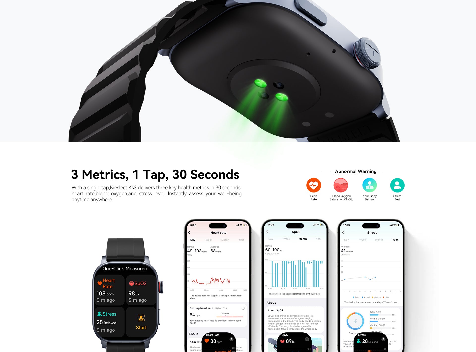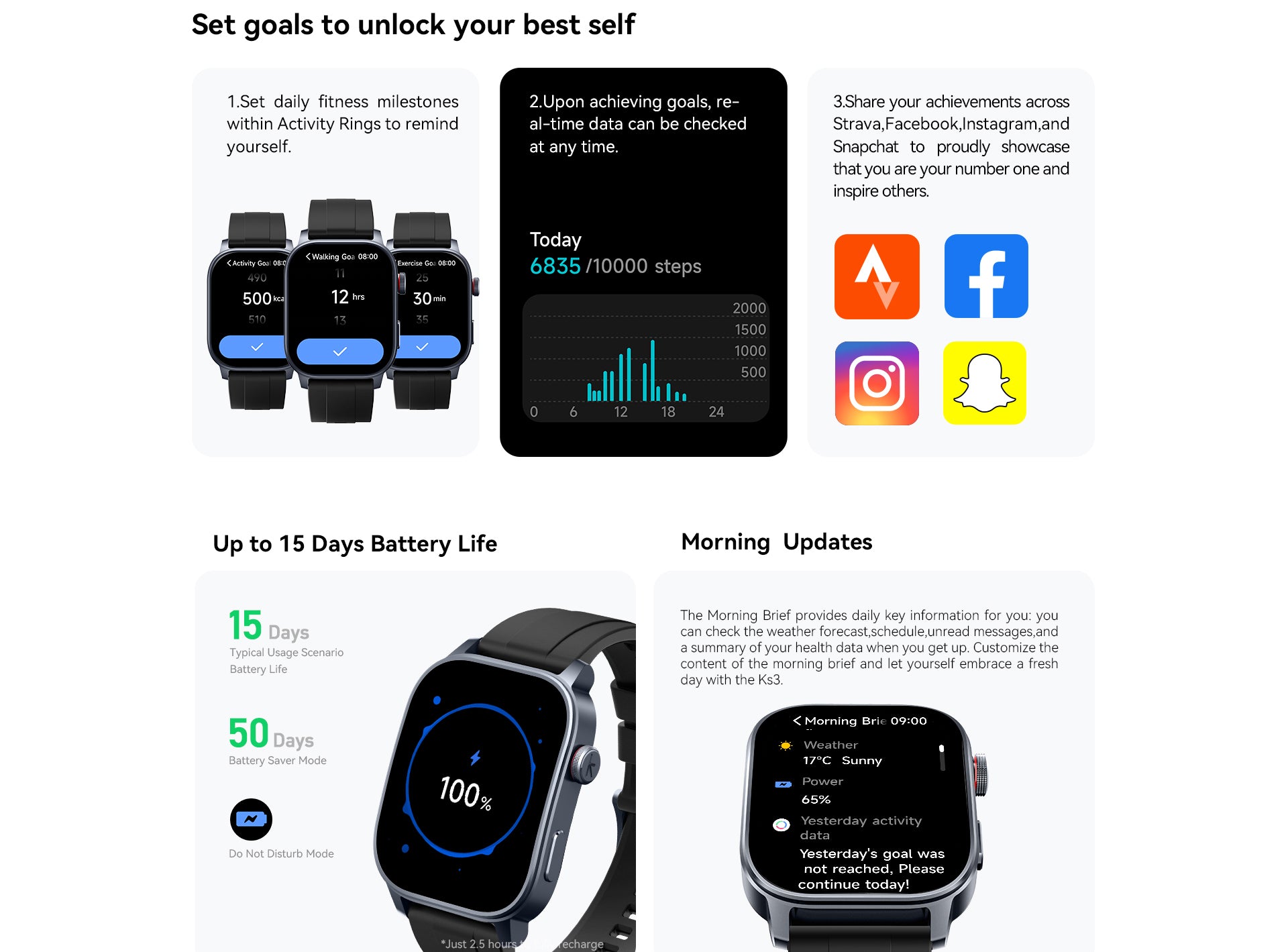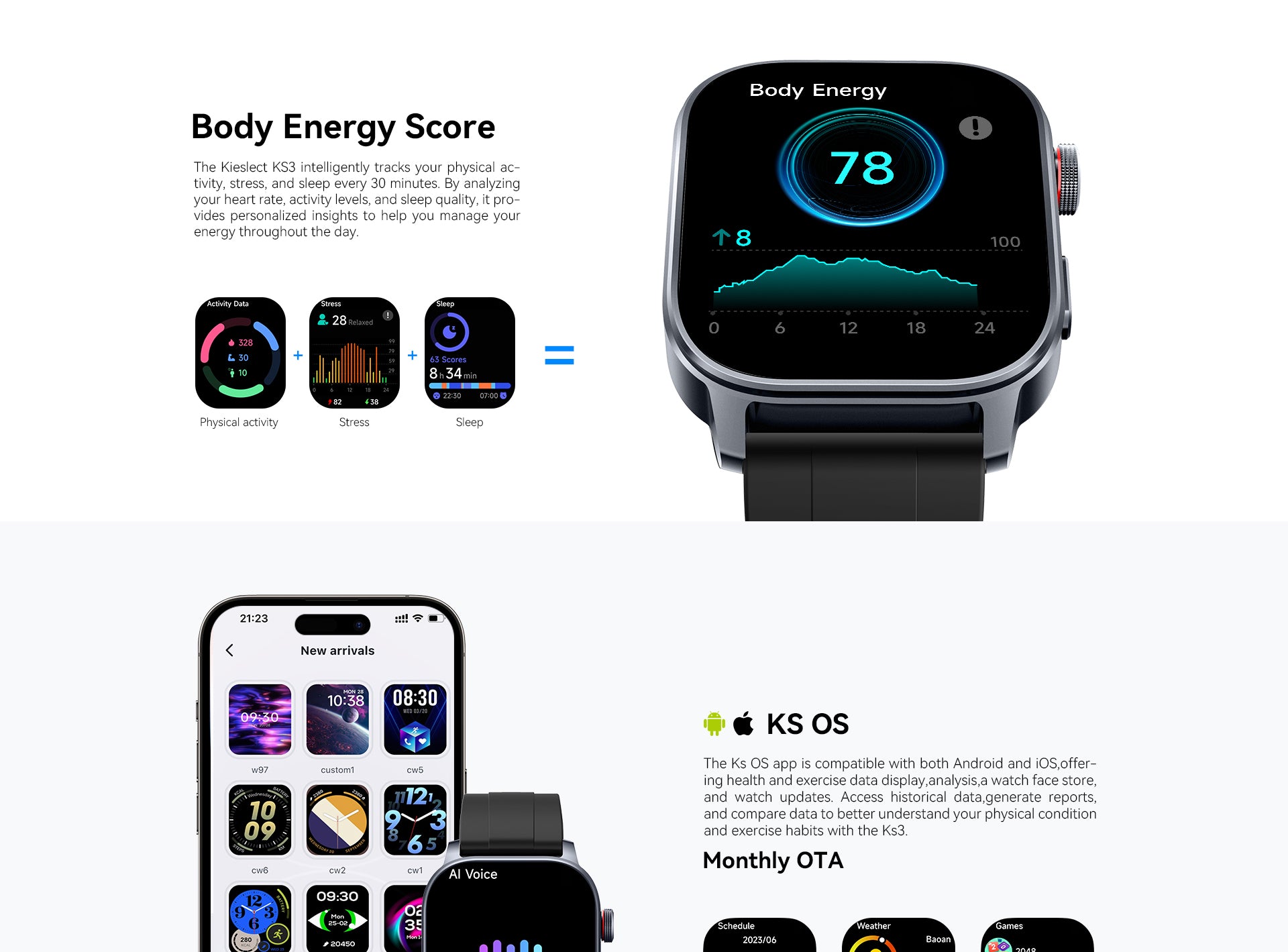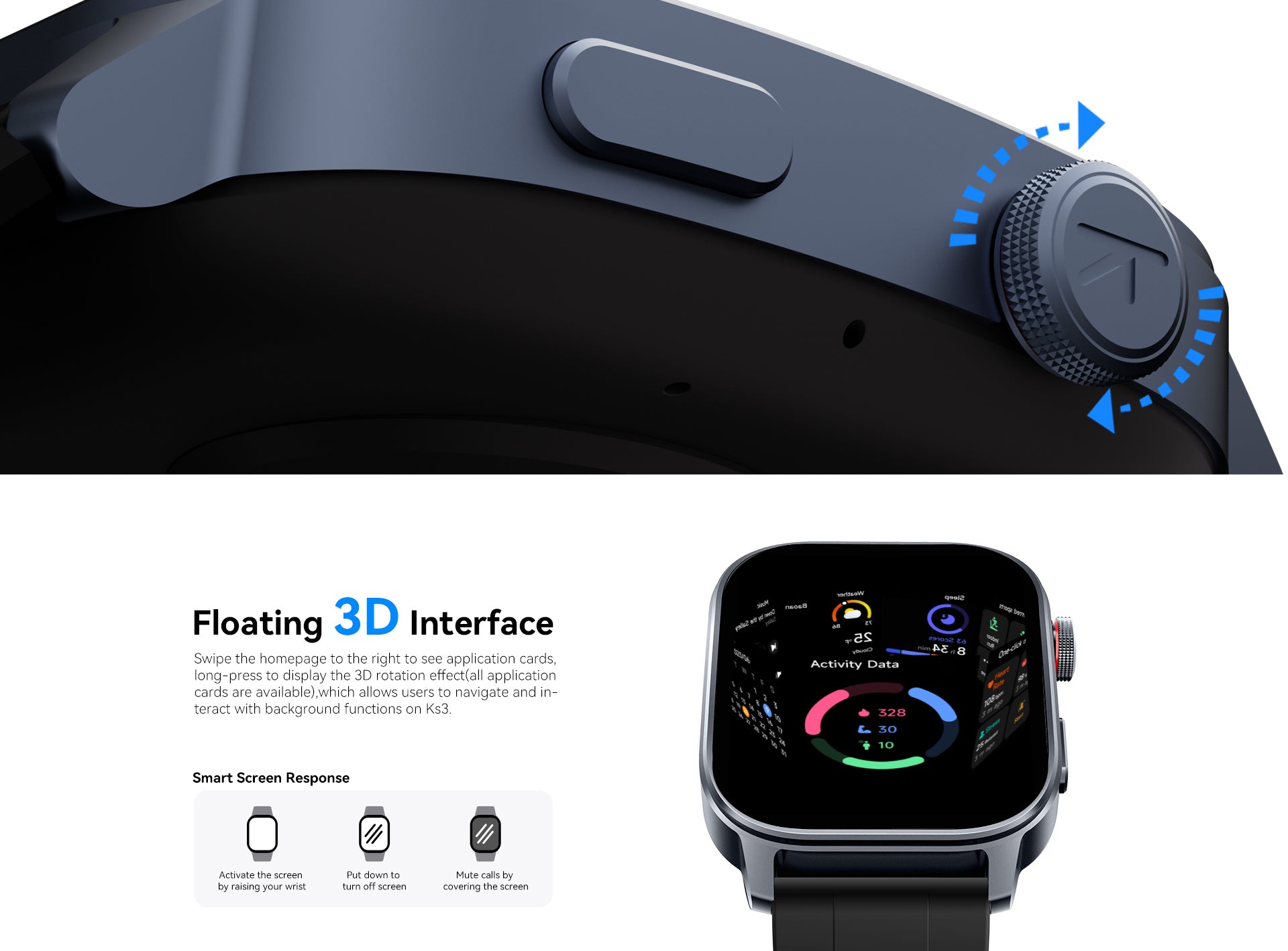 Smartwatch Kieslect Watch KS3 – Ecran : AMOLED 2.1″ (410 x 502 pixels) – Système d’exploitation : Android 6.0 et IOS 9.0 – Connectivité : Bluetooth 5.3 – Capacité de la batterie : 400 mAh – Autonomie : Jusqu’à 15 jours, Mode économie de batterie 50 jours – Temps de charge : moins de 2.5 heures – Matériel du corps en Aluminium – Bracelet en Silicone – 2 Boutons – Luminosité 1000 nits – Taux de rafraichissement : 60Hz – GPS : Positionnement GPS de précision et 6 systèmes satellites – Appels Bluetooth clairs et stables – Plus de 150 modes sportifs ( Marche en plein air, Course à pied, Course en salle, Machine elliptique…) – Surveillance de la santé 24h/24h – Faites tourner la molette de navigation – Interface flottante 3D – 20 Langues – Etanchéité 5ATM – Couleur : Noir