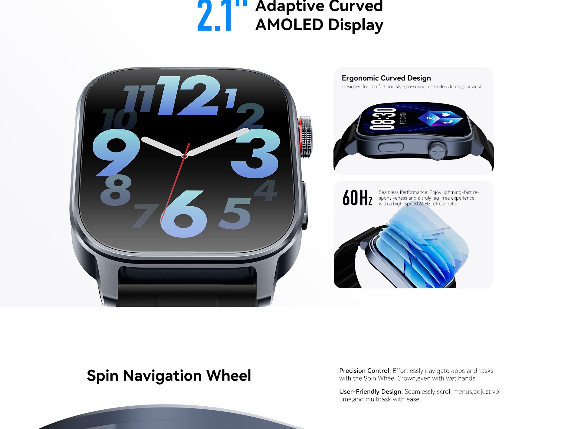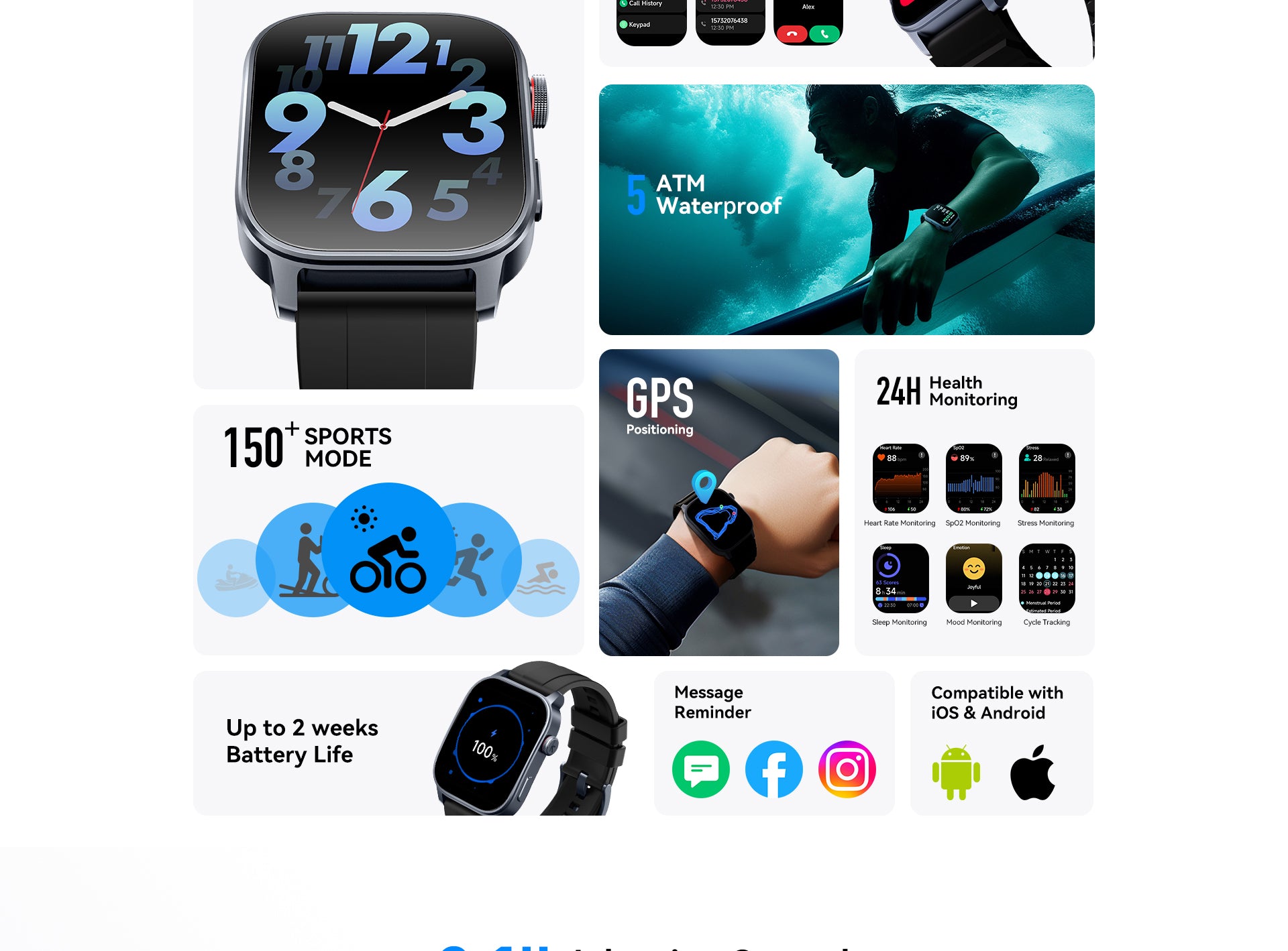 Smart Watch Kieslect Calling Watch Actor – Ecran : Amoled+ LTPO 1,6 Pouces (480 x 480 pixels) – Système d’exploitation : Android, iOS – Connectivité : Bluetooth 5.3 – Capacité de la batterie : 500 mAh – Autonomie : 10 jours ( Mode économie de batterie 44 jours, Utilisation typique 15 jours ) – Temps de charge : Moins de 2.5 heures – GPS : précision à 0,6 mètre -Taux de flash : 60Hz – La lunette en céramique a été améliorée à travers 140 étapes, atteignant une dureté de 1 500 HV, proche de celle du diamant – 16,7 millions de couleurs fidèles à la réalité – luminosité maximale : jusqu’à 1 000 nits- Plus de 150 modes sportifs ( Marche en plein air, Course à pied, Course en salle, Machine elliptique…) – Etanchéité : 5 ATM – Poids : 37.8g – Dimensions : 46.5 x 46.5 x 12.2 mm – Couleur : Noir