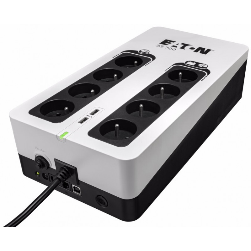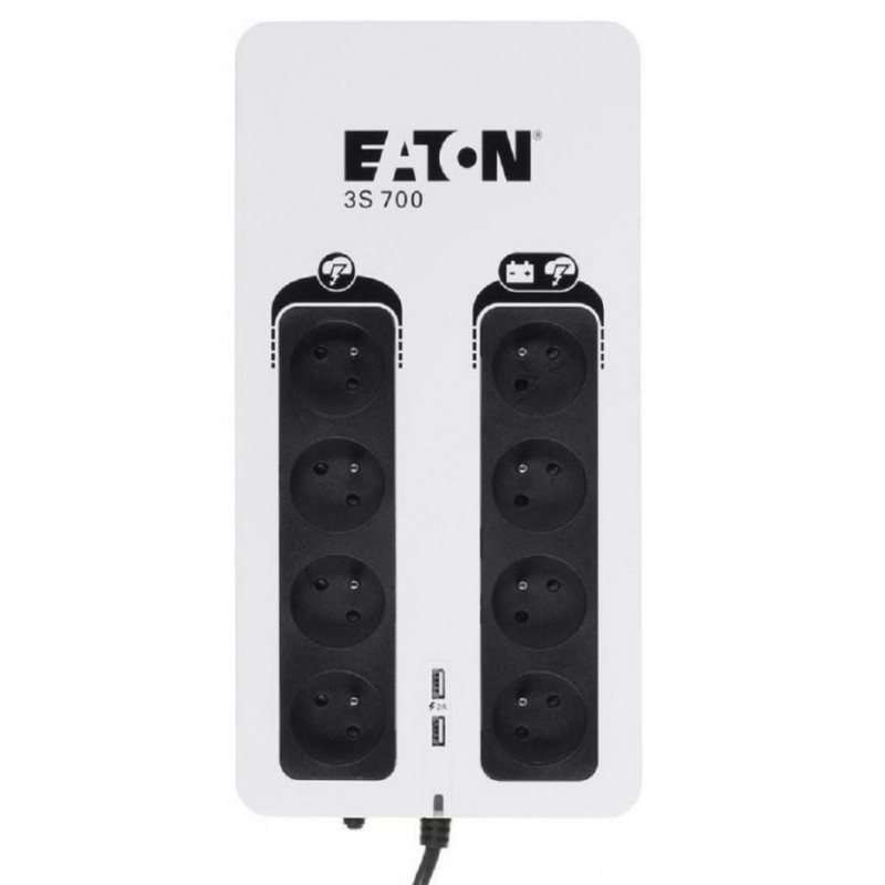 Onduleur off-line – Eaton 3S – Puissance: 700VA / 420W – Autonomie à 100% de charge: 2 min – USB – Prises sorties: Modèles FR (6 prises FR avec parasurtension, dont 3 avec autonomie) – Couleur: Blanc et noir