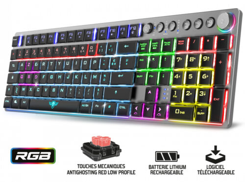 Clavier Mécanique SPIRIT OF GAMER XPERT K1500 – Technologie de Connectivité Double Mode: Sans Fil(Bluetooth et RF 2.4 GHz)/ Filaire – Interface avec l’ordinateur: USB – Norme du clavier: AZERTY – Batterie Rechargeable 2200mAh – Autonomie: 12 heures avec RGB / 60 heures sans RGB – Temps de charge: 3 heures – Nombre de touches: 105 – Touches Multimédia: Raccouris via touches Fn;Touches dédiées Musique et RGB – Clavier Gamer avec touches mécaniques – Rétro-éclairage RGB 20 modes – Avec Pavé numérique – Longueur du câble: 1.5 mètre – Dimensions: 43.2 x 12.6 x 3 cm – Poids: 630 g