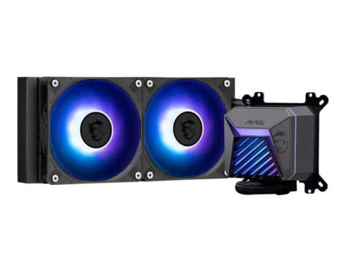 Modèle : MSI MAG CORELIQUID A15 240 , Radiateur : Aluminium 240 mm – 277 × 119.6 × 27.2 mm , Tubes : EPDM + IIR renforcés (390 mm) , Ventilateurs : 2 × 120 mm Rifle Bearing , Vitesse Ventilateur : 500–2050 RPM ±150 , Débit d’air : 64.89 CFM , Niveau sonore : 28.7 dBA max , Pompe : 3400 RPM ±10 % – 20 dBA , Matériau du bloc : Cuivre , Éclairage : ARGB Gen2 synchronisable , Compatibilité : Intel LGA 1851/1700, AMD AM5/AM4 , Durée de vie : Pompe 50 000 h / Ventilateurs 40 000 h , Accessoires inclus : Pâte thermique + visserie complète