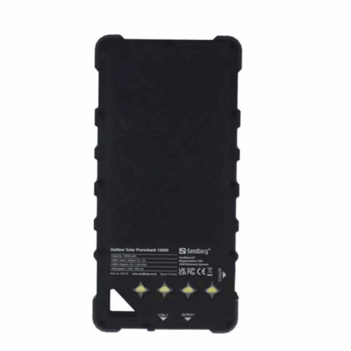 Power Bank solaire Sandberg Outdoor, Certifié IP67 anti-poussière, IP67 anti-choc et étanche, Capacité: 16000 mAh / 59,2 Wh, batterie Li-ion, Entrée/sortie USB-C: 5 V/3 A, Sorties USB-A: 5 V / 3,4 A au total, Connecteurs: 1x USB-C femelle, 2x USB-A femelle, se charge via USB ou les cellules solaires intégrées: Panneau solaire (1,4 W / 280 mA), Temps de charge au soleil: 51 heures, Temps de charge par USB 1A: 13 heures (jusqu’à 6 cycles de charge pour un smartphone typique), capacité de charger 2 appareils simultanément, Prend en charge la transmission. Indicateur de batterie à 4 LED, lampe de poche (4 x LED).
