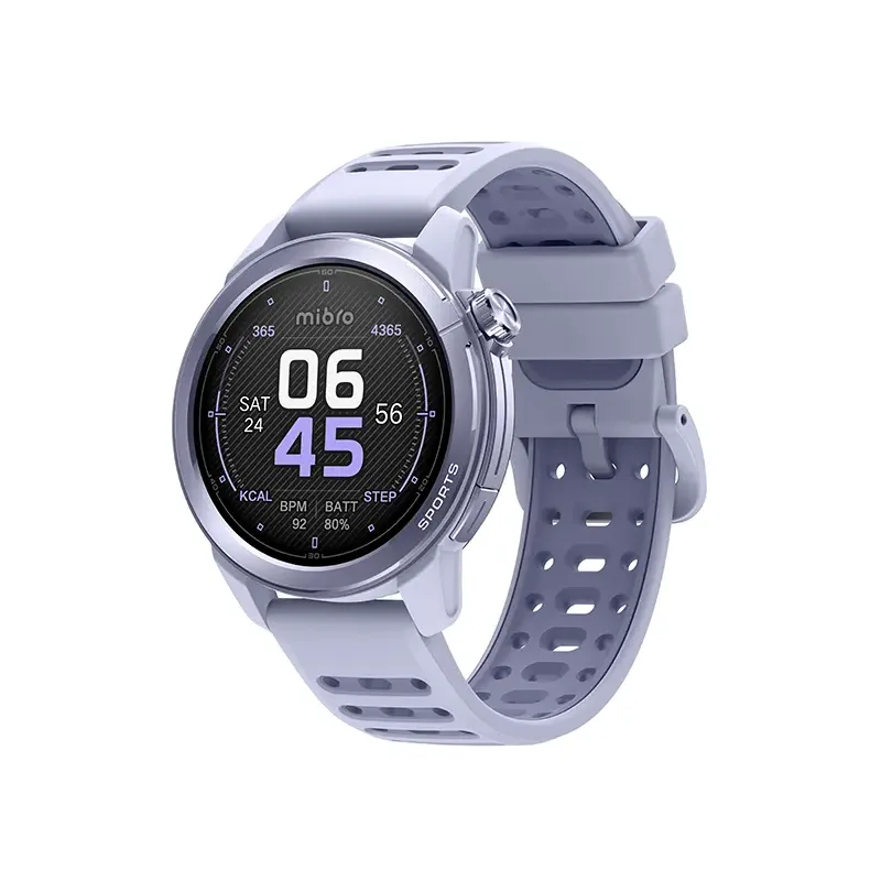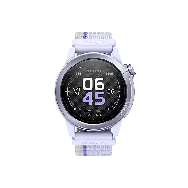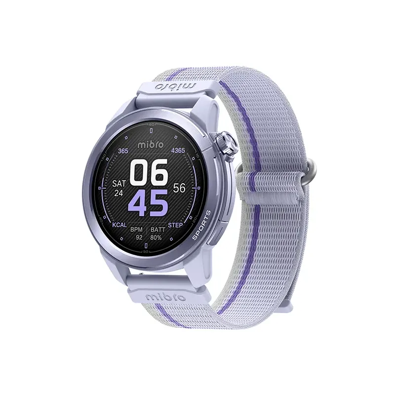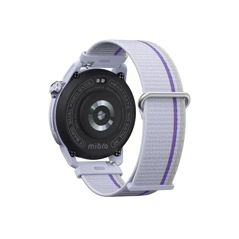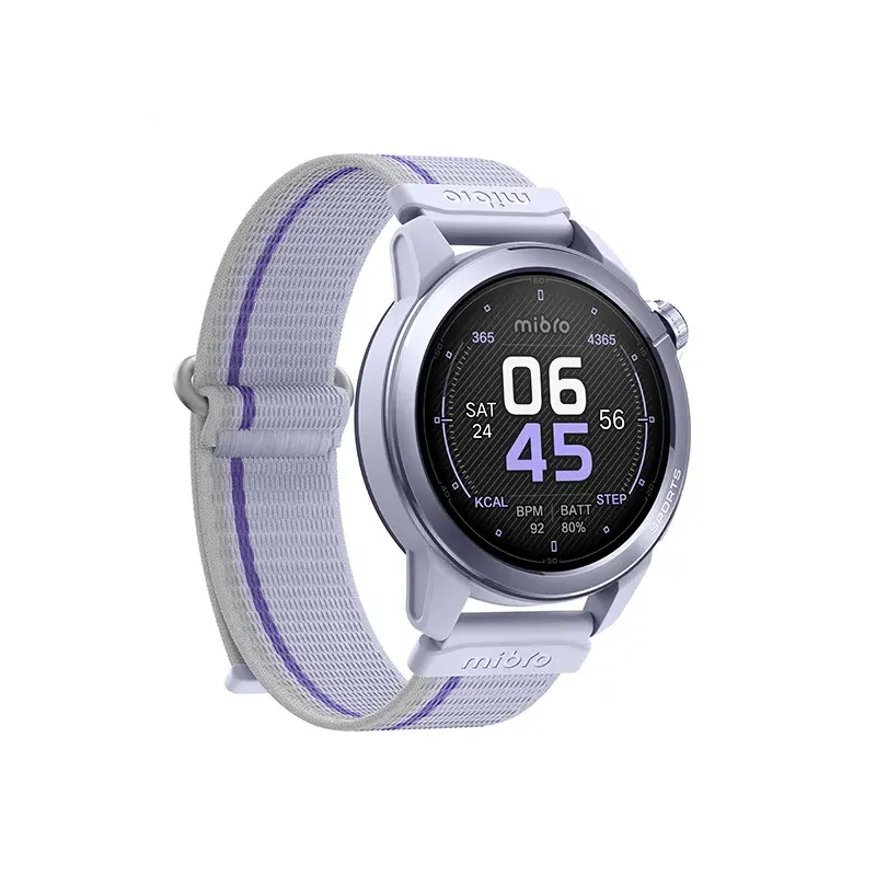 Smartwatch Mibro Watch GS Active 2 – Écran AMOLED 1.32″ (466 x 466, AOD, 1 200 nits, PPI 353) – Matériel : Alliage d’aluminium + (PA+GF) + Silicone liquide bicolore/Tissé – Autonomie de la batterie : Mode veille : 45 jours / Mode quotidien : 15 jours / Mode GPS : 15 heures, appel BT : 7 heures, musique : 6 heures – Type de charge magnétique – Bluetooth 5.3 – Capteur : PPG Fréquence cardiaque, Oxygène dans le sang, Accéléromètre, Gyroscope, Magnétomètre, Altimètre, Baromètre, Capteur de lumière, Carte NFC – Positionnement par satellite GPS/ Beidou/ GLONASS/ Galileo/ QZSS – Étanche: 5 ATM – Taille de la bande : Tissu, boucle en plastique, largeur : 22 mm, longueur dépliée : 246 mm / Boucle en silicone liquide bicolore + PC, largeur : 22 mm, longueur dépliée : 265 mm – Poids : 39,9 g (bracelet tissé), 51,7 g (bracelet en silicone) – Couleur Violet