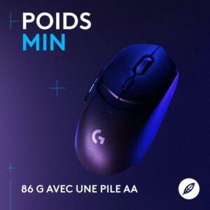 Souris Gamer LOGITECH LIGHTSPEED G309 – Technologie de Connectivité: Sans Fil – Interface avec l’ordinateur: USB-A – Résolution: 100-25600 dpi – Capteur Héros 25K – Max. accélération: >40 G – Max. vitesse: 400 IPS – Jusqu’à 5 profils de mémoire embarqués – Commutateurs hybrides optiques-mécaniques LIGHTFORCE SWITCHES – Pieds en PTFE à faible friction – Mouvement constant plus de 300 heures avec LIGHTSPEED sans fil, plus de 600 heures avec Bluetooth – Couleur: Noir