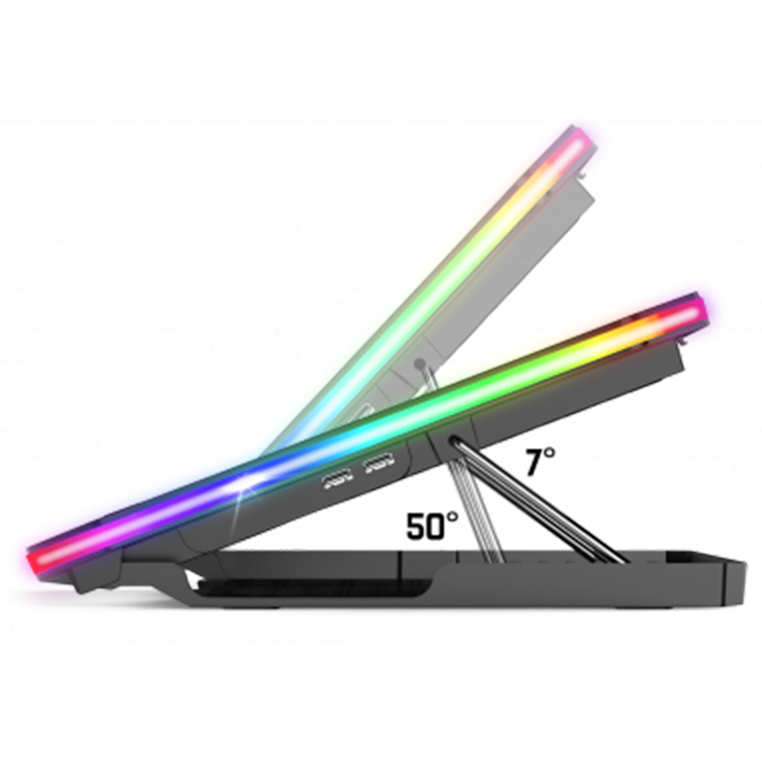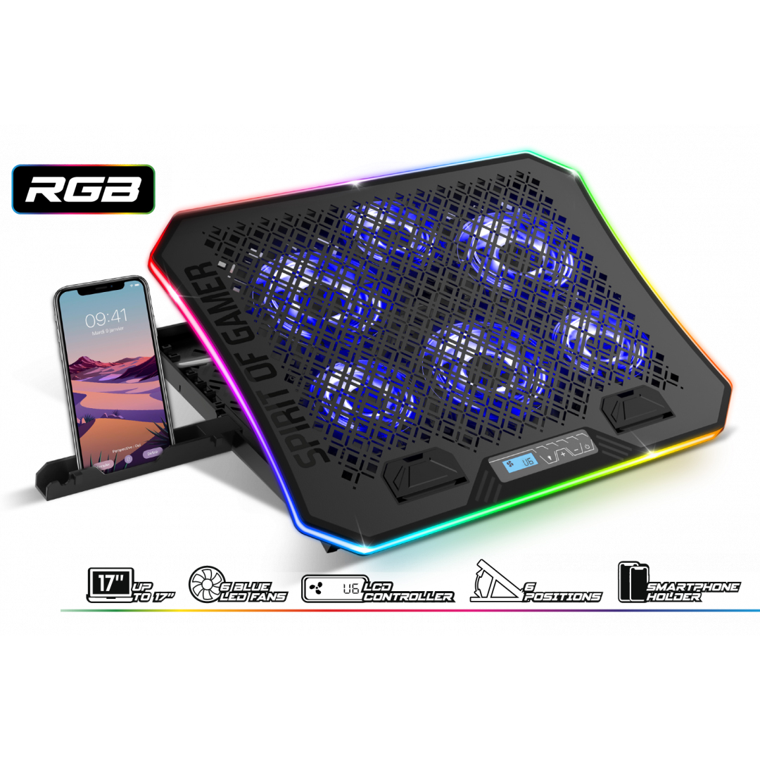 Refroidisseur pour ordinateur portable de 10 à 17 » – Contrôleur LCD – 6 ventilateurs à rétroéclairage LED bleu : 3x 110 mm (1300 rpm max) et 3x 70 mm (2100 rpm max) – 6 positions avec inclinaison ajustable de 7° à 50