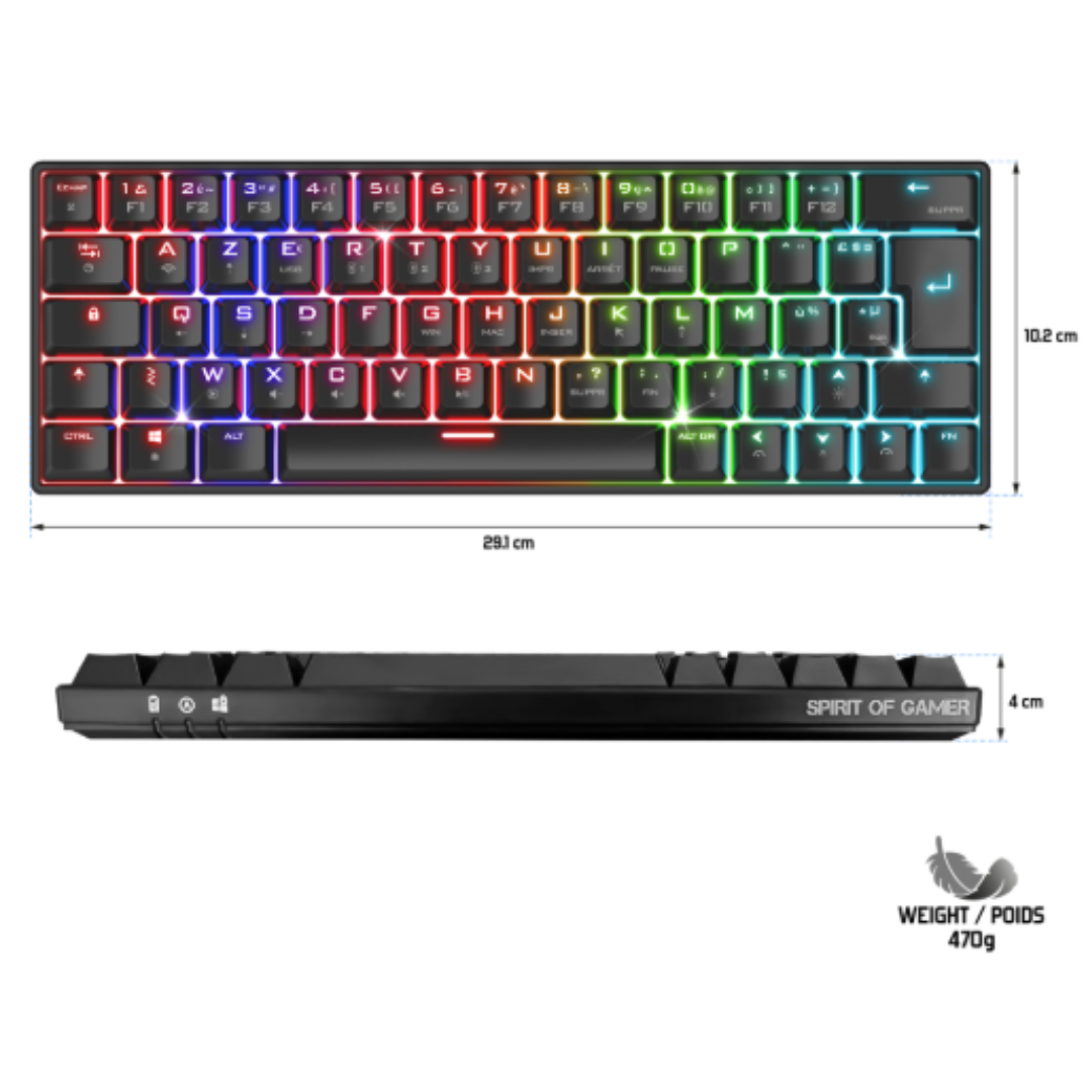 Clavier Mécanique SPIRIT OF GAMER XPERT K1500 – Technologie de Connectivité Double Mode: Sans Fil(Bluetooth et RF 2.4 GHz)/ Filaire – Interface avec l’ordinateur: USB – Norme du clavier: AZERTY – Batterie Rechargeable 2200mAh – Autonomie: 12 heures avec RGB / 60 heures sans RGB – Temps de charge: 3 heures – Nombre de touches: 105 – Touches Multimédia: Raccouris via touches Fn;Touches dédiées Musique et RGB – Clavier Gamer avec touches mécaniques – Rétro-éclairage RGB 20 modes – Avec Pavé numérique – Longueur du câble: 1.5 mètre – Dimensions: 43.2 x 12.6 x 3 cm – Poids: 630 g