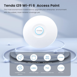 Point D’accès Sans Fil Long Portée Tenda I29 – Nombre de Ports : 2 ( 1x Mbps Ethernet Port , 1x Mbps Ethernet Port (PoE) ) – Normes Réseau : 10/100/1000 Mbps – Alimentation : IEEE 802.3at PoE – Taux de Transfert : 2.4 GHz data rate :1-574 Mbps , 5 GHz data rate: 6-2402 Mbps – Montage: Mur/Plafond – Technologies : OFDMA, spatial multiplexing et MU-MIMO – Nombre maximal de clients connectés : 254 – Indicateur LED : RGB – Dimensions: Φ250,6×55 mm – Couleur : Blanc